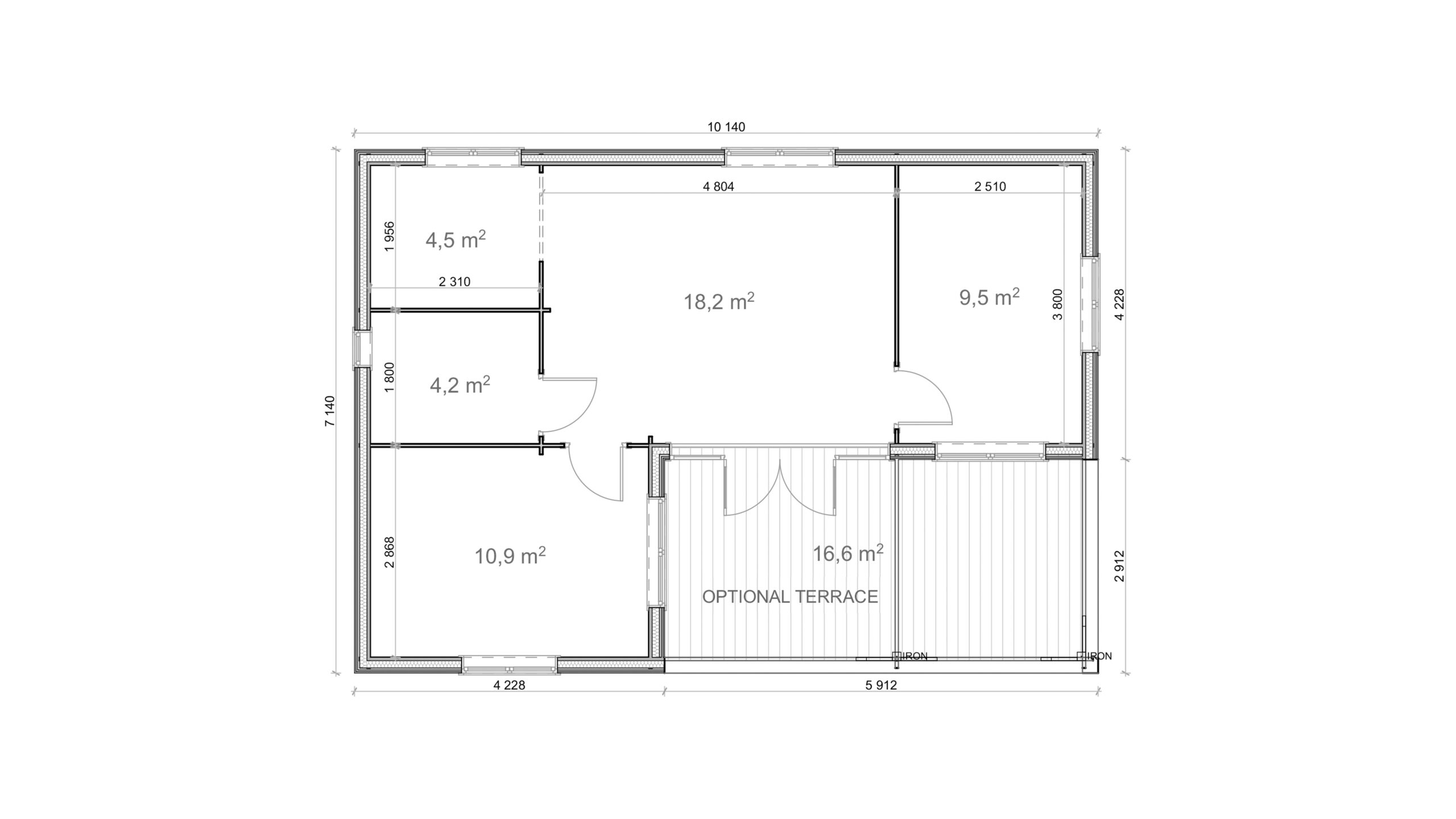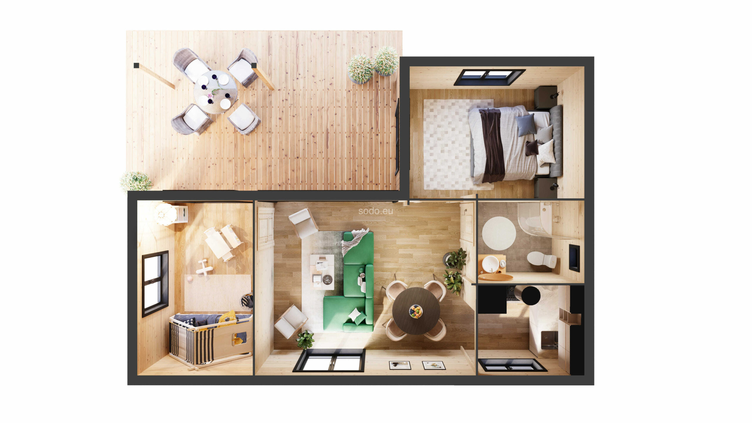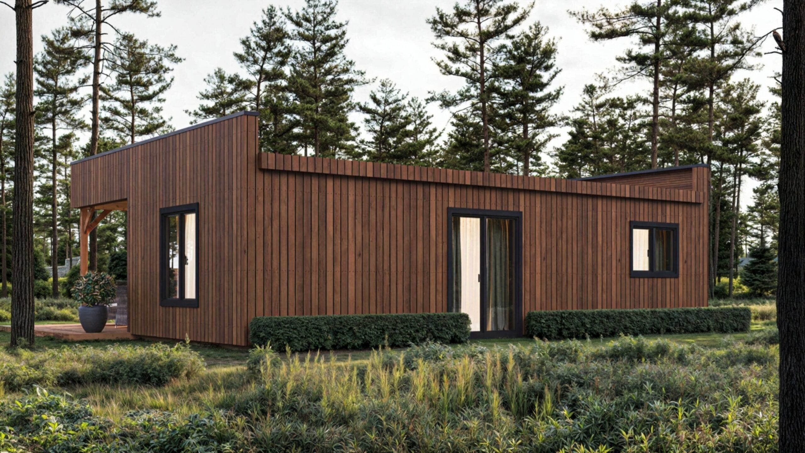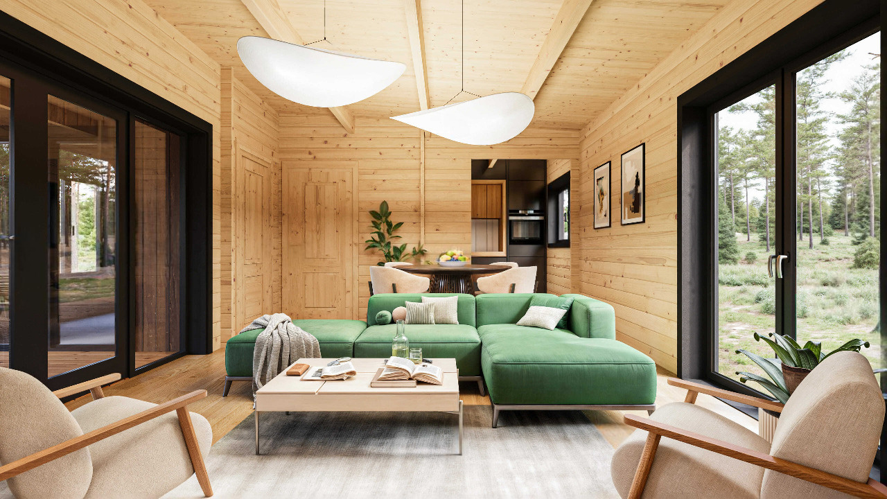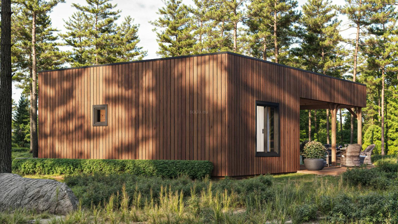 This stylish one-story, modern roof insulated wooden cabin features 2 separated bedrooms, a cozy living room, a distinct kitchen zone, and a modern bathroom. The design includes wide main entrance doors, full-height windows for abundant natural light, and a roofed terrace that can be ordered separately—perfect for outdoor dining or quiet relaxation amidst nature.