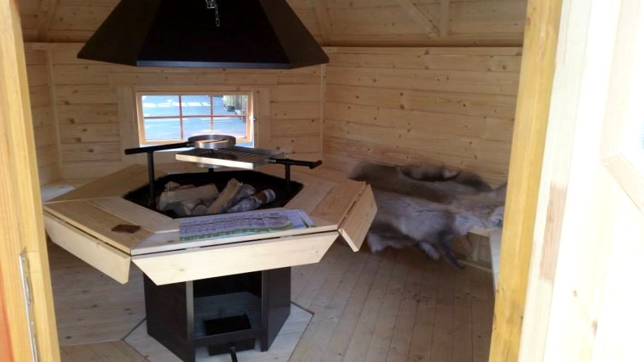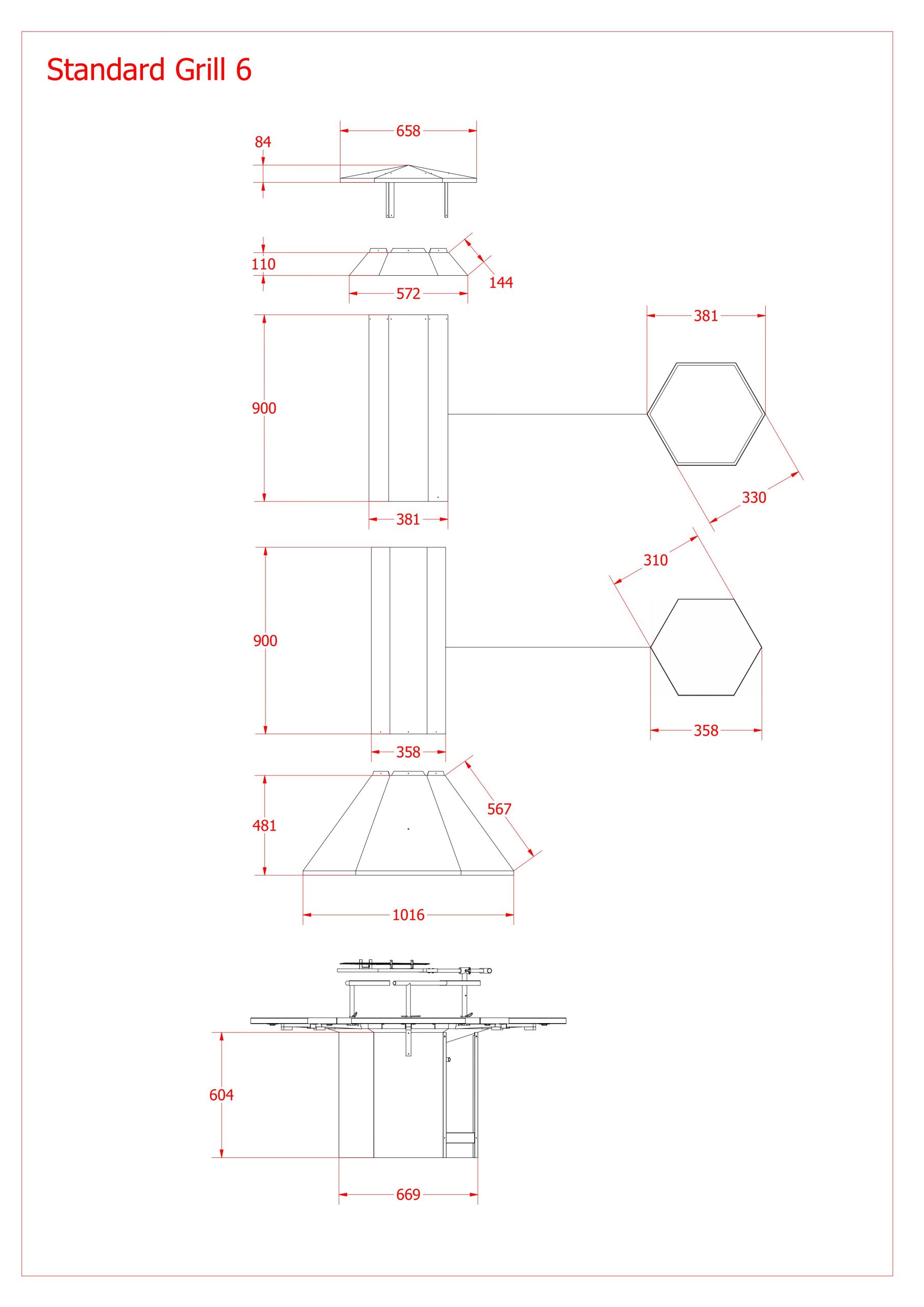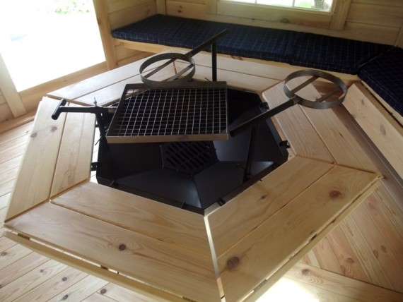 Fire box is produced from cold-rolled steeland coated with heat resistant black paint (RAL 9005). Smoke hood and grill body is produced from cold-rolled steel and coated with heat resistant brown paint (RAL 8019). Cooking grates are produced from stainless steel. Large grate designed for grilling vegetables, meat and fish (6-corner, diagonal 480mm). Two small grates for coffee or soup pot (round grid, Ø 195mm)